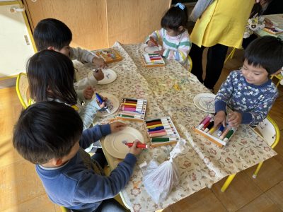 紙皿にペンで模様をつけて、シールを貼って飾り付けしました。
