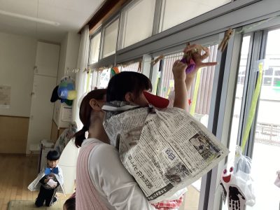 新聞紙を使って、ドラキュラに仮装をしていた2歳児ぺんぎん組さん。