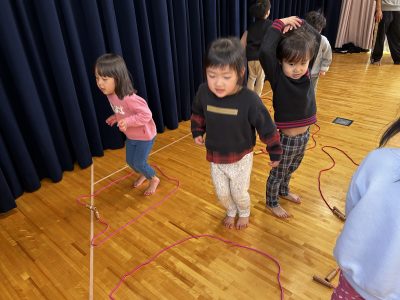 両足ジャンプ、二跳躍がたくさん出来たら次は外で縄跳びをします😄
