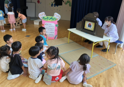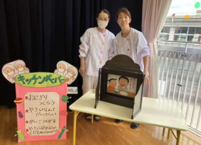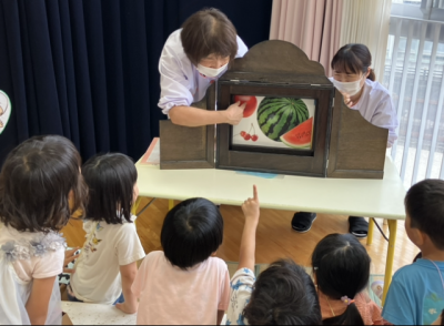 給食先生が食べ物のお話の紙芝居を読んでくれました。