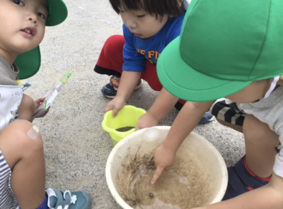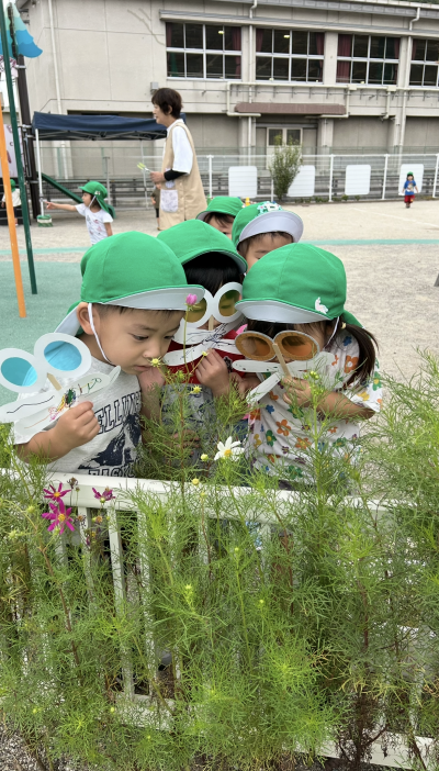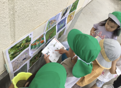 少しずつ秋の気配をかんじはじめたころ、ぺんぎん組が園庭で秋見つけをしていました。