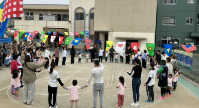 全員が無事見つかったら、大きな園になってみんなで『てのひらをたいように』を踊りました。