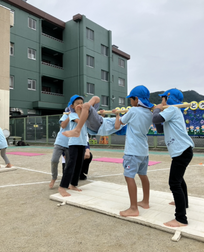 ねらいは『友だちと力を合わせやりきることを味わう、できるようになったことやこれまで経験したことを思いっきり出し切る』です。