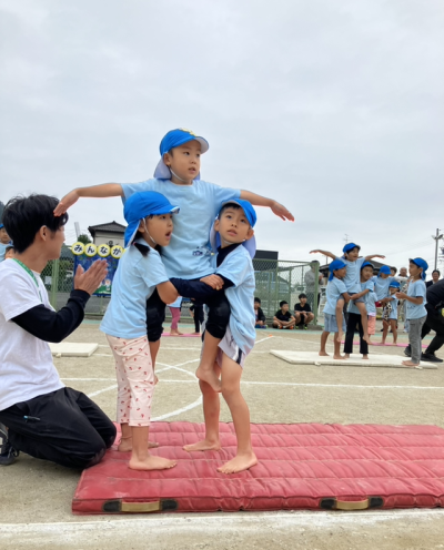 組体操では、3人組になり『扇・ピラミッド・おみこし』の技に挑戦しました。