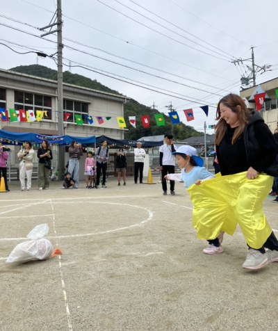 大きいパンツの片足ずつ親子で入り、ボールを蹴って進みます💨