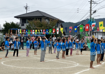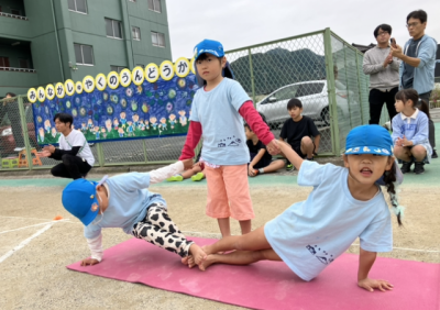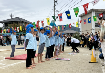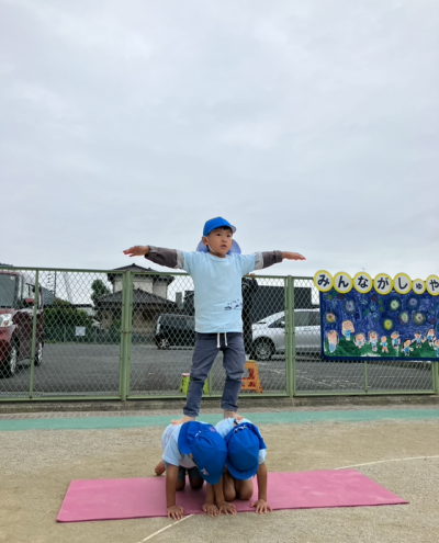 組体操では、3人組になり『扇・ピラミッド・おみこし』の技に挑戦しました。