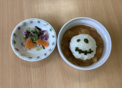 おばけの目(グリンピース)と口(にんじん)を自分でつけて顔を作りました。