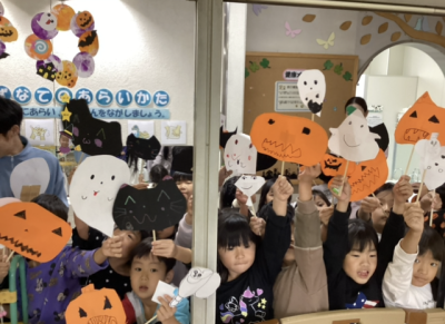 きりん組はハサミを使って、のりとチーズでおばけの顔を作りました✂