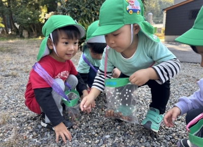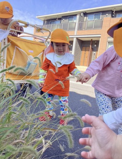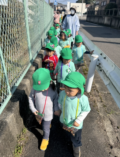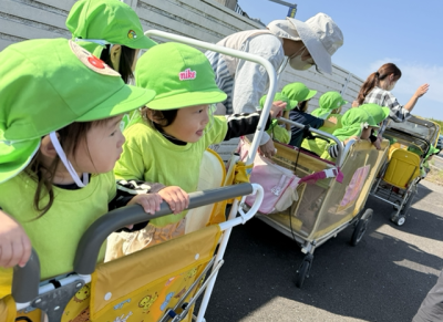 カートに乗っていきましたが、途中で保育者や友だちと手をつないで歩いてみたり、ゆったりとお散歩を楽しみました。