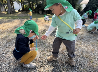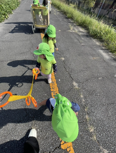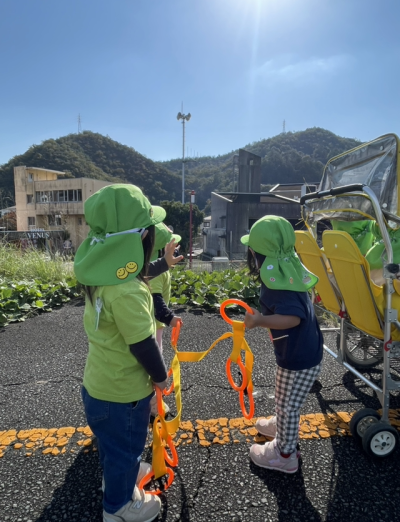 カートに乗っていきましたが、途中で保育者や友だちと手をつないで歩いてみたり、ゆったりとお散歩を楽しみました。