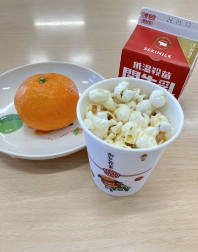 お年玉の中は、みかんとポップコーンカップでした😋