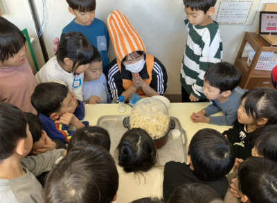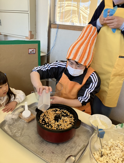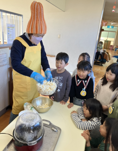大きいクラスは、ポップコーンマシーンでポップコーンを作る様子を見てから食べました♪