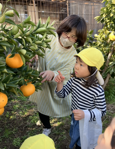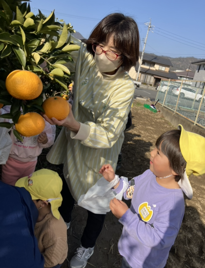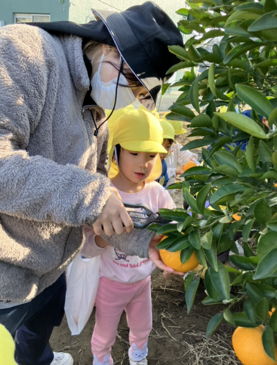 八朔は枝についている部分が固いので、子どもたちが選んだものを畑先生や保育者が切ります✂