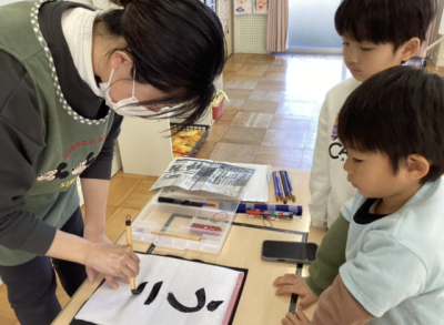 師範の資格のある酒井陽子先生が、子どもたちに習字での字の書き方を教えてくれました。