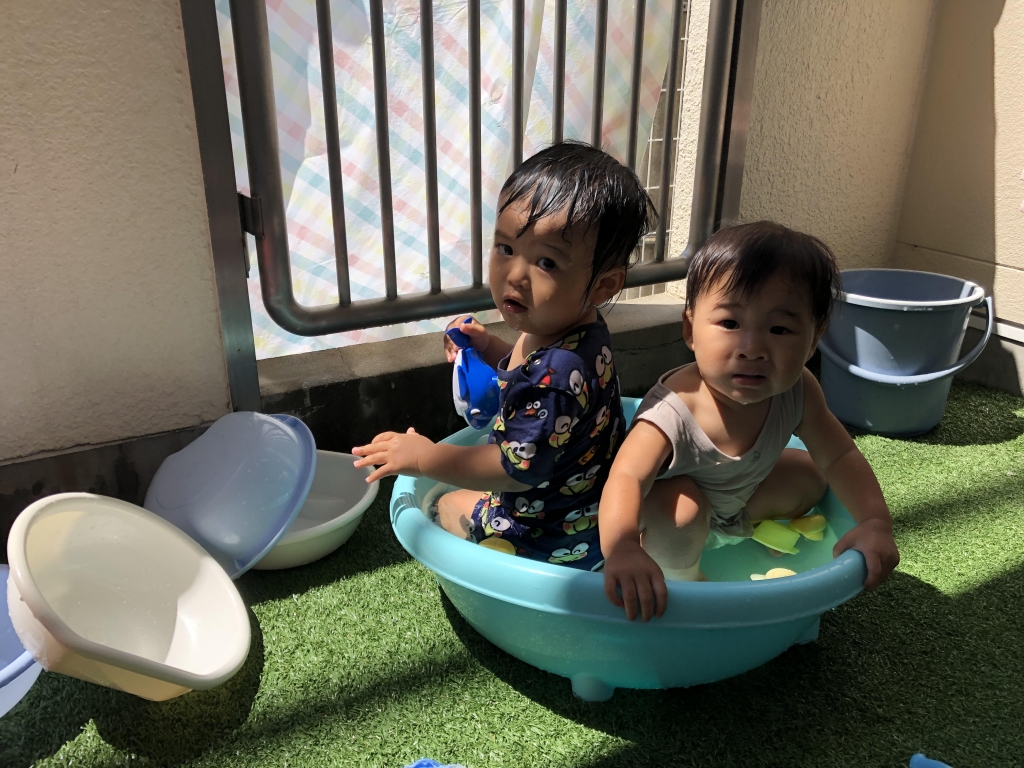 保育園では、いちばん小さなひよこ組さんもテラスでの水遊びを楽しんでいます!