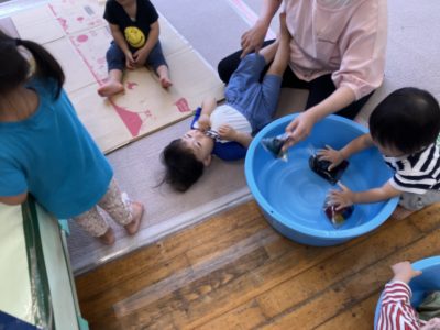 先週の梅雨明け間近の雨続きの日、水遊び・プール遊びはお預けです。