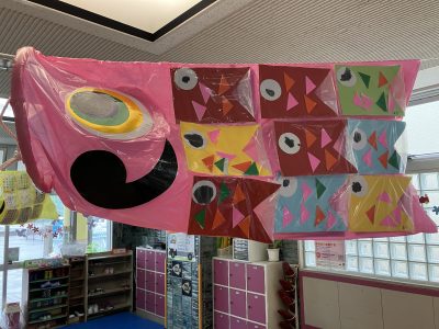 大きな目玉に色とりどりのうろこがついたこいのぼりはぱんだ組です。みんな元気に泳いでいます。