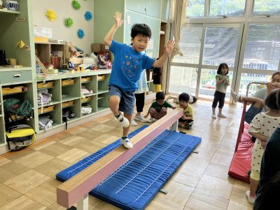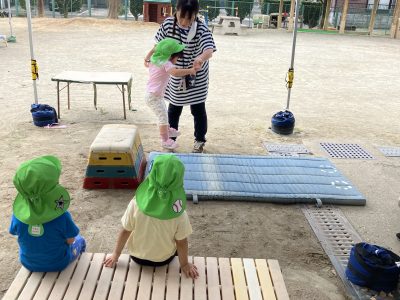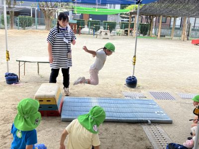 園庭では、りす組さんが跳び箱3段から見事な大ジャンプです。