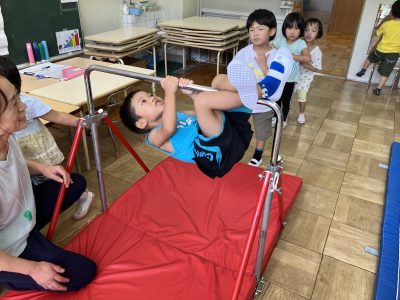 鉄棒や平均台でも、自分の得意技を頑張っています。