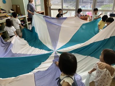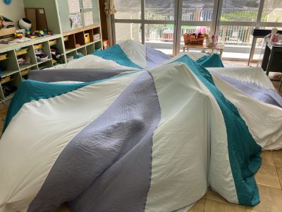 室内遊びでは、部屋いっぱいにパラバルーンを広げてメリーゴーランドやテントをつくって楽しんでいます。