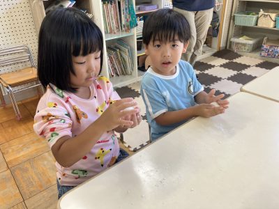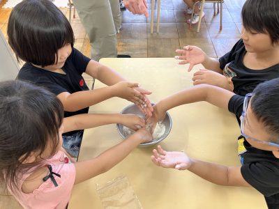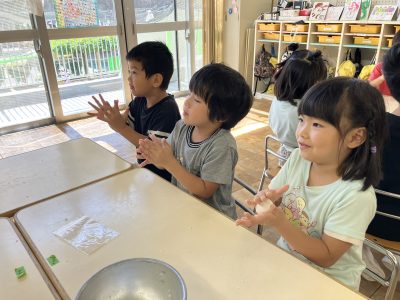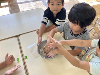 「いい匂いがする~」、「柔らかい~」「たべた~い」、様々な感想を言い合いながら作りました。