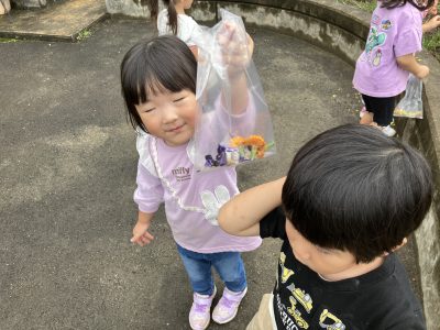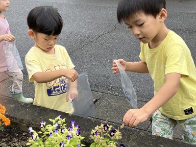 うさぎ組さんは夏花壇の名残からおすそ分けの花を摘んで色水遊びをしています。赤や黄色、紫の花を