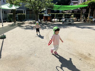 おや、りす組さんがリングバトンをもって走っています。オータムフェスティバルで以上児クラスが頑張っていた