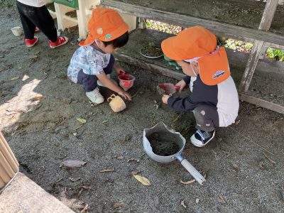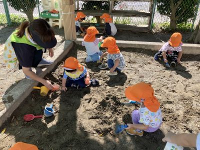 砂場の日陰では、ひよこ組さんが砂遊びをしています。涼しくなったせいで心置きなく砂場遊びに熱中できます。