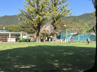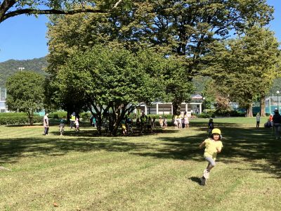 広場を思いっきり走ったり、木の実や葉っぱを集めたりしています。並んで歩いているのは今度の遠足に向けて