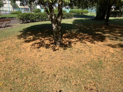 野一色公園の木の下には黄色のじゅうたんが敷き詰められています。きんもくせいの甘いいい香りが