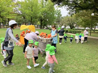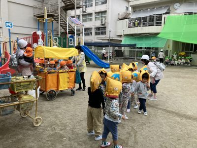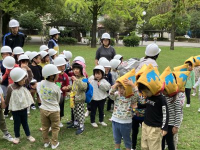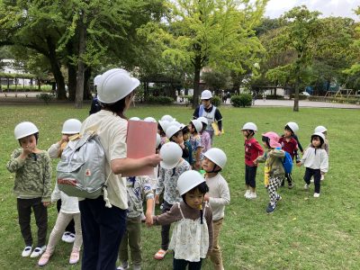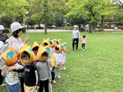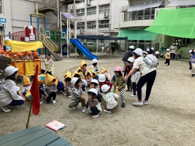 いつもの園庭避難からさらに野一色公園まで避難するという流れでした。子どもたちは毎月行っている訓練から、