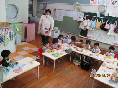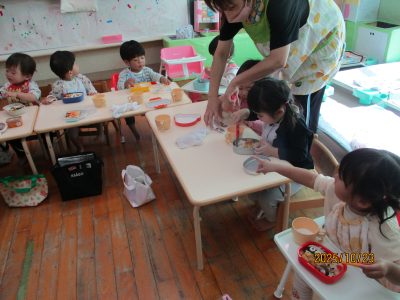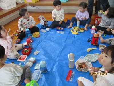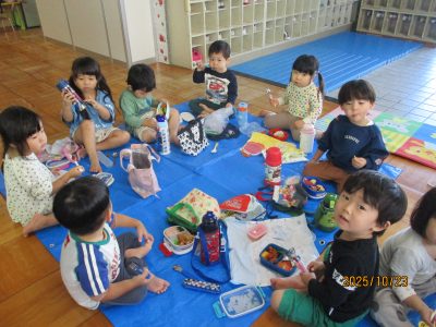 未満児クラスは保育園に戻ってのお弁当タイムです。みんなでお弁当を食べるって楽しいよね。
