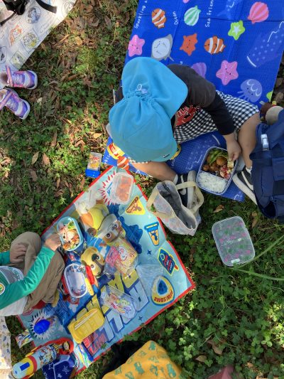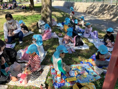 以上児クラスは科学館の隣の大きな公園、八ツ草公園へ移動して早速お弁当を広げました。