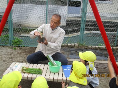 はじめに園長先生から苗の植え方について見本を見せながらの説明がありました。子どもたちは興味津々です。