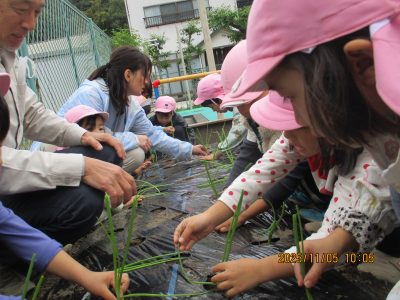 保育園では「食育活動」の一環として「育てる喜び、作る喜び、食べる喜び」を味わうことを大切にしています。