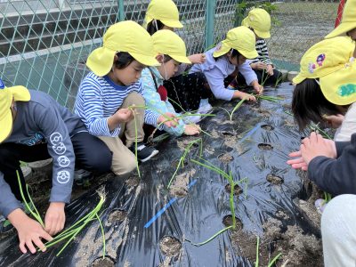 苗植えを頑張ってくれたのはきりん組とぱんだ組の子どもたちです。合言葉は「優しく土づくり、
