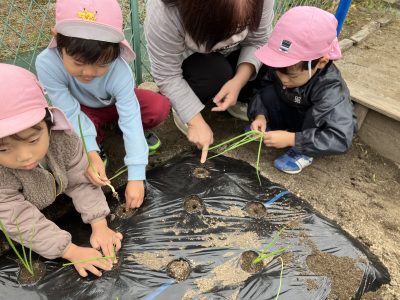 まずは園長先生からの植え方説明から始まりました。ぱんだ組の子どもたちにとっては初めての経験です。