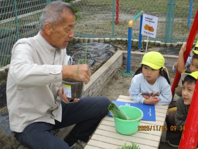 はじめに園長先生から苗の植え方について見本を見せながらの説明がありました。子どもたちは興味津々です。