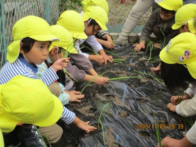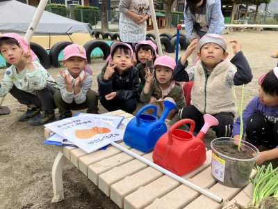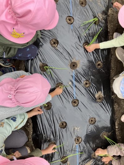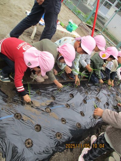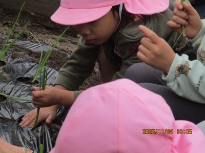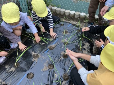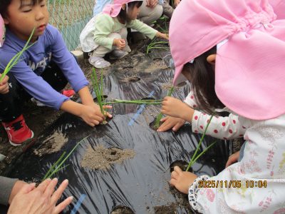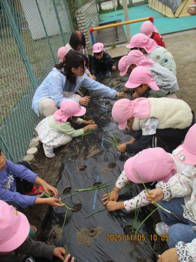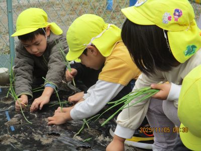 11月初旬、保育園では毎年この時期にたまねぎの苗植えを行っています。今年の5月も大きく育った玉ねぎを100個
