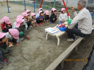 まずは園長先生からの植え方説明から始まりました。ぱんだ組の子どもたちにとっては初めての経験です。