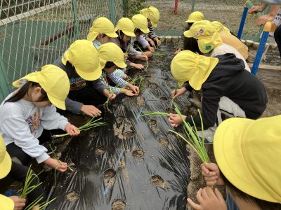 苗植えを頑張ってくれたのはきりん組とぱんだ組の子どもたちです。合言葉は「優しく土づくり、