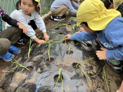 早速子どもたちは一人3本ずつの苗をもらって挑戦しました。説明をしっかり聞いていたせいもあって、真剣に