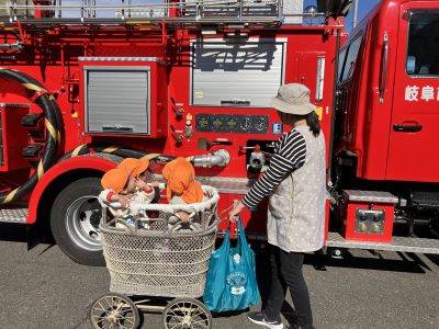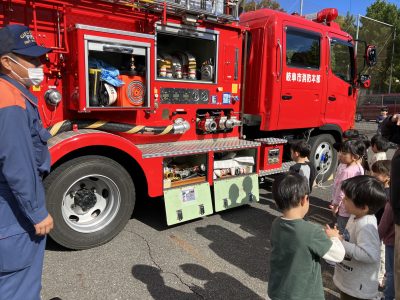 その後は、ぐるっと消防車の周りを見学、「あれは何?」、「これは何?」と消防署員さんは、子どもたちの質問攻めに、