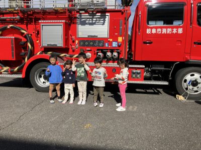 そして今日の避難訓練のもう一つの楽しみは消防車見学です。まじかに見る消防車に子どもたちはドキドキしています。