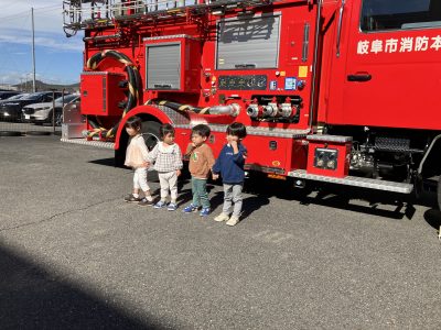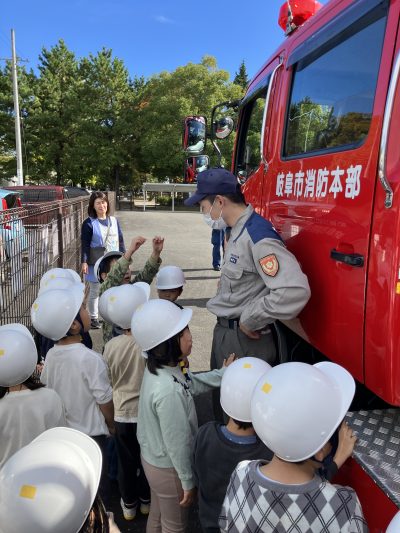 そして今日の避難訓練のもう一つの楽しみは消防車見学です。まじかに見る消防車に子どもたちはドキドキしています。