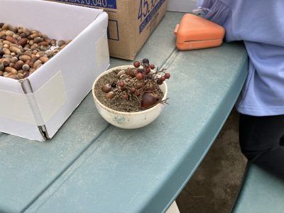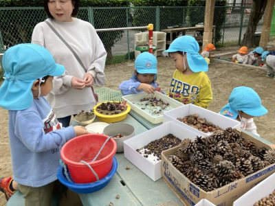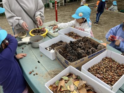 うさぎ組さんはこれまでにも秋のいろいろな木の実や花を使って制作遊びを楽しんできました。