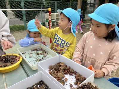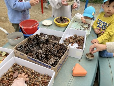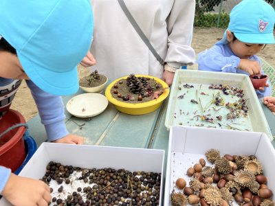 うさぎ組さんはこれまでにも秋のいろいろな木の実や花を使って制作遊びを楽しんできました。