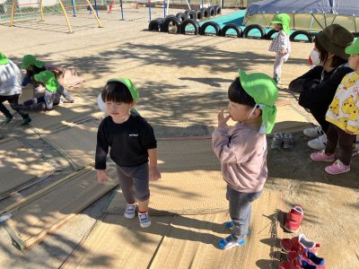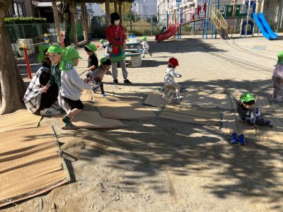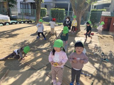 他のクラスはみんな野一色公園にお散歩です。園庭はりす組さんの貸し切り状態です。