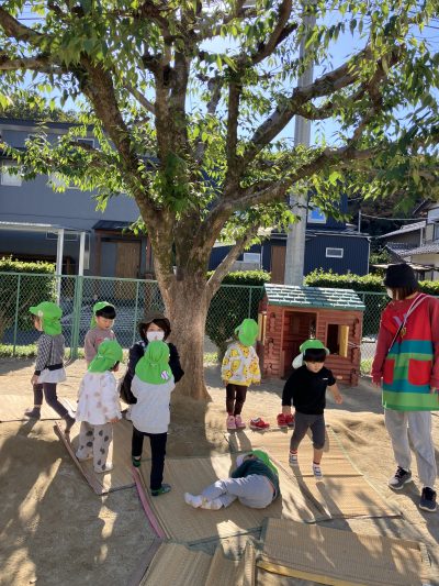 朝夕はずいぶん寒くなりましたが、日中には暖かな日差しがさします。園庭のシンボルツリーの下ではりす組の