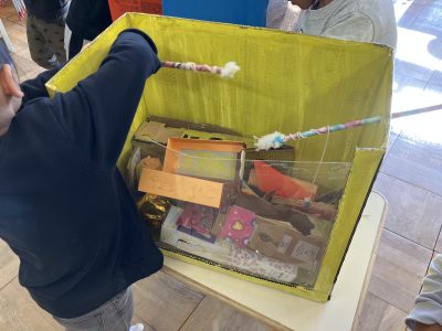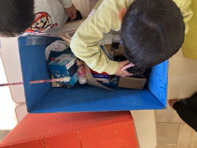 未満児クラスの小さなお友だちもできるようなクレーンゲームも作っています。本番が楽しみですね。